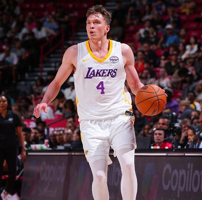 克内克特的低迷则更具延续性。这位上赛季季后赛被直接DNP的首轮秀,此役26分钟内10中2,三分7中1,仅得6分6篮板,命中率与三分率分别低至20%和14.3%。比赛中他多次出现“空位不敢投、接球就失误”的局促表现,第一节的空位三分打铁与第二节的传球失误,直接导致湖人错失追分良机。更令人担忧的是,这并非偶然——夏季联赛他场均命中率仅32.1%,三分率23.7%,投射稳定性的缺失,让湖人本就薄弱的外线雪上加霜,克内克特本该成长为湖人外线最可靠的射手,但是如今他离预期目标似乎越来越远。球迷的调侃:“他们不是在争夺轮换位置,而是在竞争‘卧龙凤雏’席位。”